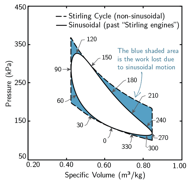 To follow the Stirling cycle, an engine must be capable of non-sinusoidal motion. Traditional engines use a crank shaft, which produces sinusoidal motion. The blue shaded area in this plot shows the work lost during each rotation of the engine when sinusoidal motion is used. We patented our TrueCycle method of accomplishing non-sinusoidal motion in our Stirling engines, which produces much higher efficiencies.